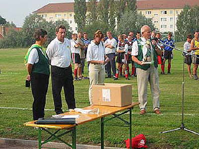 Edgar Preller (Reipischer Heimat-verein, rechts) und Doris Arndt (MUEG, 2.v.re.) überbringen Glückwünsche an die Friesen