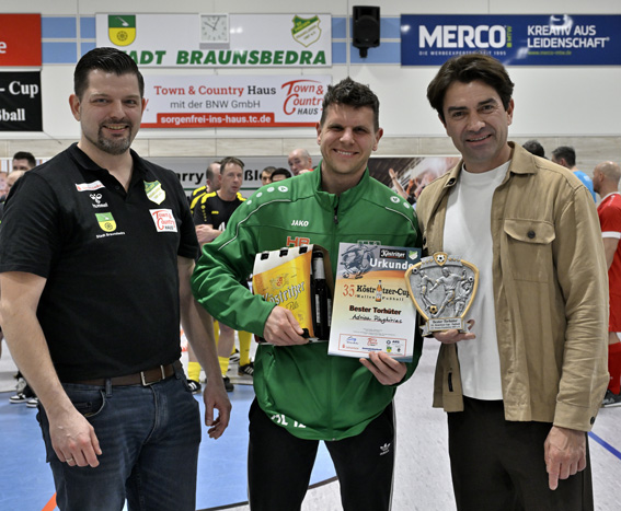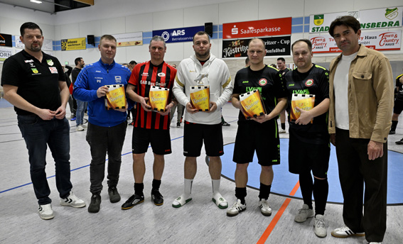 Die Ehrenpreise der Köstritzer Schwarzbierbrauerei überreichten Maik Patzner und Friesenchef Thomas Wasner. Möglich gemacht wurde das traditionsreiche Hallenturnier einmal mehr durch die langjährige und vertrauensvolle Zusammenarbeit mit der Köstritzer Schwarzbierbrauerei, vertreten durch Gebietsverkaufsleiter Niels Rozynek, sowie dem Getränkehof Patzner.