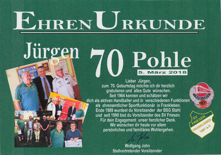 Am 5. März überreichte Friesen-Vize Wolfgang John eine Vereins-Ehrenurkunde an Jürgen Pohle, anlässlich dessen 70. Geburtstages. Mit den Glückwünschen danke John den langjährigen Vorsitzenden für sein ehrenamtliches Engagement für die Friesen und für Frankleben.