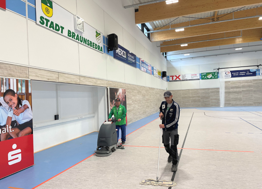 Nachdem vor Ostern durch die Friesen-Sportstättenmitarbeiter Bernd Leopold und Dirk Sander (auf dem Foto von links) der gesamte Sozialtrakt geputzt wurde, folgte dann die Grundreinigung der Sporthallenfläche.