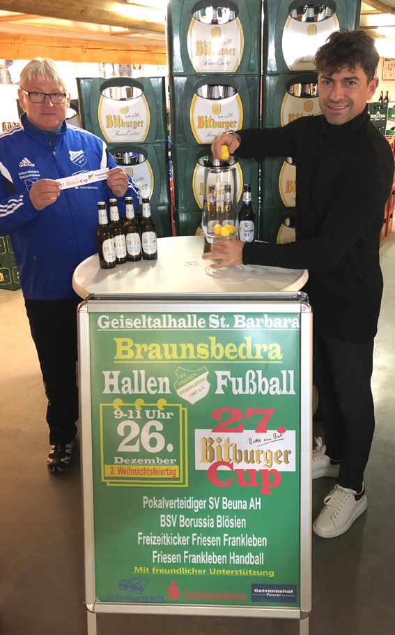 Die Spielfolge für das Turnier wurde beim Sportförderer Getränkehof Patzner in Langeneichstädt am 20. November ausgelost. Franklebens Ortsbürgermeister Günter Küster (links im Bild) nahmen gemeinsam mit Maik Patzner (rechts) die Auslosung vor.
