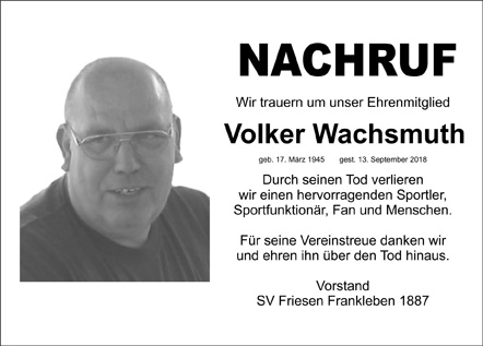 Seit 1951 war Volker Wachsmuth in der Betriebssportgemeinschaft (BSG) Stahl/SV Friesen Frankleben organisiert. Nach seiner aktiven Zeit als Handballer war er lange Jahre bis zur Wende in verschiedenen ehrenamtlichen Funktionen der BSG tätig.