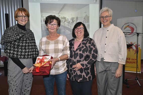 Große Ehre für Viola Japel, die von der stellvertretende Landrätin des Saalekreises Annett Hellwig (v.l.) Kreissportbund Präsidentin Angela Heimbach und von der Landessportbund Präsidentin Silke Renk-Lange ausgezeichnet wurde.