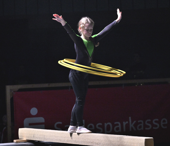 Mit Reifen auf dem Schwebebalken Meliah Oehme, rechts Alina Schmund . Fotos: Wolfgang Kubak.