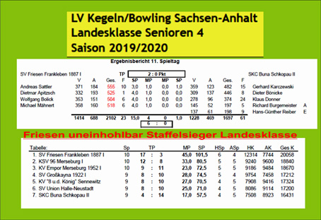 Die einzelnen Ergebnisse: SV Friesen Frankleben -HV Wernigerode 25:19, TSV Niederndodeleben - SV Friesen Frankleben 32:11, HG 85 Köthen - SV Friesen Frankleben 17:26, SV Friesen Frankleben - SV Oebisfelde 17:24, SV Wacker 09 Westeregeln -SV Friesen Frankleben 16:19, SV Friesen Frankleben - HBC Wittenberg 28:13 und SV Union Halle-Neu. II -SV Friesen Frankleben 23:23.
