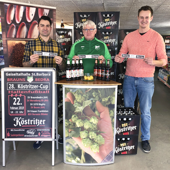 begehrten Pokal und die Sachpreise kämpfen. Die Auslosung der Spielfolge erfolgte kürzlich beim Sportförderer Getränkehof Patzner in Langeneichstädt durch Maik Patzner, Günter Küster (Ortsbürgermeister Frankleben) und Niels Rozynek (auf dem Foto von links).