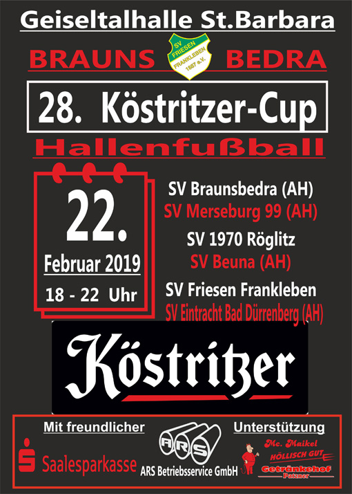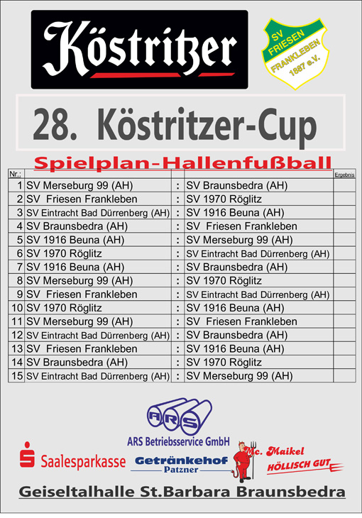 Danach wird der Pokalverteidiger SV Merseburg 99 (AH) das Auftaktspiel gegen den SV Braunsbedra (AH), der mit Sven Seemann den Torschützenkönig in der Mannschaft hatte, bestreiten. Weitere Turniermannschaften sind SV Beuna (AH), SV Eintracht Bad Dürrenberg (AH), SV 1970 Röglitz und Gastgeber SV Friesen Frankleben.