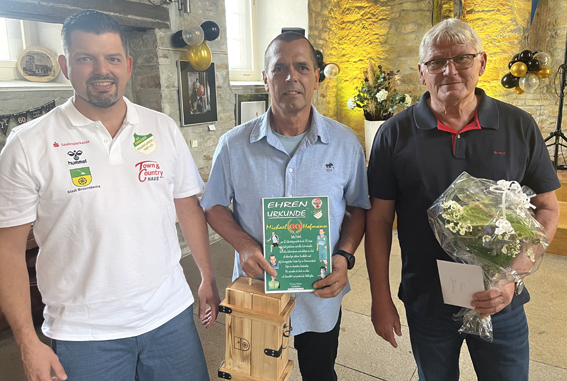 Neben den vielen Gratulanten gab es auch Glückwünsche und Dankesworte vom Franklebener Ortsbürgermeister Günter Küster (rechts) und natürlich auch vom Vorsitzenden Thomas Wasner (links).