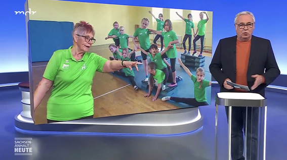 Der Mitteldeutsche Rundfunk (MDR) war im Bürgerzentrum, um sich ein Bild vom sehr guten Gesamteindruck der Turnhalle und dem umfassenden Engagement der langjährigen Ehrenamtlichen Christine Fiedler (im Anmoderationsfoto mit Andreas Neugeboren) zu machen.